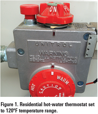 圖2示出了典型的燃?xì)鉄崴骱銣仄,該恒溫器運(yùn)行具有連續(xù)可變?cè)O(shè)置的模擬表盤(pán),范圍從VACATION模式到HOT(一些制造商標(biāo)記為頂端非常熱)。在此刻度范圍內(nèi),溫度從低到60-80ºF到高到150-160ºF。坦克制造商,EPA(環(huán)境保護(hù)局)和許多市政府建議將能效和燙傷緩解的目標(biāo)設(shè)置為120ºF。然而,OSHA,美國(guó)水暖工程師學(xué)會(huì)(ASPE)和軍團(tuán)菌專家建議至少140ºF的水殺死有害細(xì)菌[1-3]。