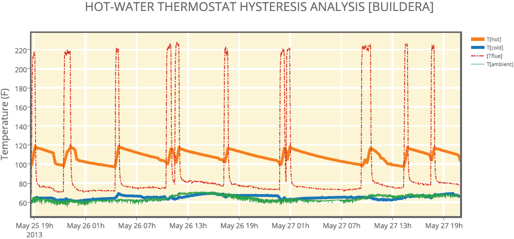當(dāng)Buildera首先在各種水龍頭上使用浸入式熱電偶(Fluke®80PK-22或類似產(chǎn)品)測(cè)試水溫時(shí),熱水溫度在113-119ºF之間測(cè)量,在考慮到加熱器和龍頭。為了沖洗管道內(nèi)的溫水,水自由流動(dòng)直到溫度穩(wěn)定在其最大值附近。這表明,在基線測(cè)量時(shí),熱水器能夠產(chǎn)生足夠的熱水以滿足淋浴。然而,這樣的測(cè)量不足以理解水溫如何隨著不同的需求負(fù)載在一天中變化,并且更具體地,為什么清晨淋浴溫度遠(yuǎn)遠(yuǎn)低于最低可接受水平。