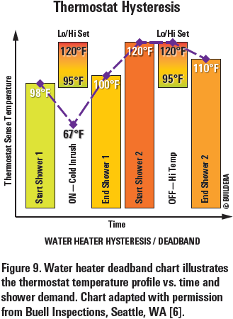憑借法醫(yī)知識(shí),補(bǔ)救辦法更加明顯。一種解決方案提高恒溫器溫度,使得低跳閘點(diǎn)至少足夠熱以用于舒適的第一噴淋。使用圖8作為建立新閾值的指南,將恒溫器設(shè)置提高10ºF至130ºF會(huì)將最低熱水輸出提高至107-113ºF,這是更合適的淋浴溫度。實(shí)際上,在將恒溫器高跳閘點(diǎn)增加到130°F之后,房主經(jīng)歷了舒適的淋浴,即使在第一次使用時(shí)。然而,該解決方案還由于更高的總體溫度和堆疊效應(yīng)而增加了燙傷的風(fēng)險(xiǎn)。