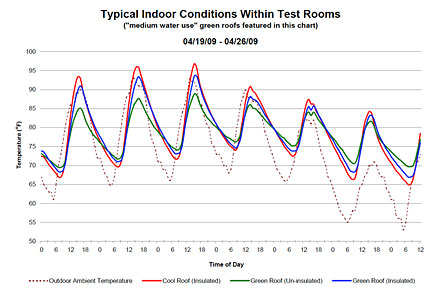研究人員利用氣象站收集表現(xiàn)證明,在白天非絕緣的屋頂綠化在降低超過兩個冷屋頂保溫屋頂綠化的能源消耗比較好,而在晚上隔熱冷屋頂是最好的降低能耗的數(shù)據(jù)。