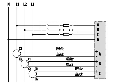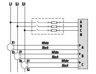 電壓斷開開關(guān):電壓斷開開關(guān) 保險絲:保險絲(安裝程序負(fù)責(zé)確保遵守當(dāng)?shù)匾?沒有保險絲包含在表.) 接地線:接地線 電壓互感器:電流互感器 :電壓互感器 :包含一個電壓斷開保護(hù)用保險絲或斷路開關(guān).保護(hù)裝置必須被評為在連接可用短路電流點(diǎn).