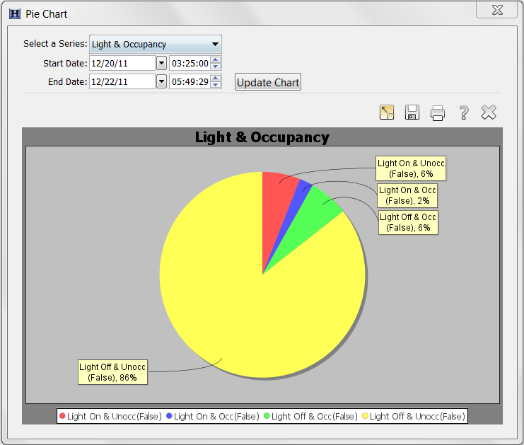 基于所選系列繪制餅圖。在此示例中,光和占用率在餅圖中繪制。圖表底部的圖例表示餅圖的每個(gè)片段代表的系列。黃色框中顯示了每個(gè)餅圖楔的百分比。