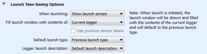 啟動時。從設備菜單中選擇啟動或單擊工具欄上的啟動圖標時,選擇“顯示啟動屏幕”以顯示啟動記錄器窗口,或選擇“自動啟動”以繞過此窗口并使用默認設置啟動記錄器。如果要在不更改任何設置的情況下快速啟動多個記錄器,選擇“自動啟動”特別有用。默認設置由“首選項的內(nèi)容填充啟動窗口”確定。