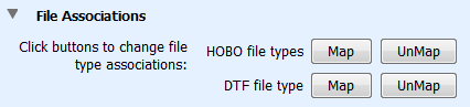 默認情況下,擴展名為.hobo,.hsec和.hproj(HOBO文件)和.dtf和.dsec(DTF文件)的文件將自動與HOBOware相關聯(lián)。這意味著這些文件由HOBOware圖標標識,并可以通過雙擊它們打開。單擊Map或UnMap按鈕更改文件類型關聯(lián)。